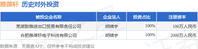 本站消息,根据天眼查APP显示,雅葆轩(920357.BJ)新增一起对外投资事件,被投资公司为芜湖致雅进出口贸易有限责任公司,法定代表人胡啸宇开源策略,投资占比为100%。该公司从事批发业,注册资本为100万人民币。目前开源策略,雅葆轩共存在对外投资2项,详见下表: