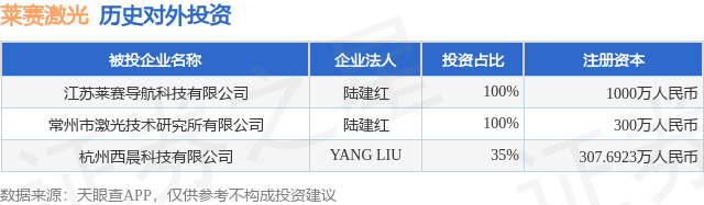 本站消息,根据天眼查APP显示,莱赛激光(920363.BJ)新增一起对外投资事件,被投资公司为江苏莱赛导航科技有限公司,法定代表人陆建红,投资占比为100%。该公司从事仪器仪表制造业,注册资本为1000万人民币。目前拾贝赢,莱赛激光共存在对外投资3项,详见下表: