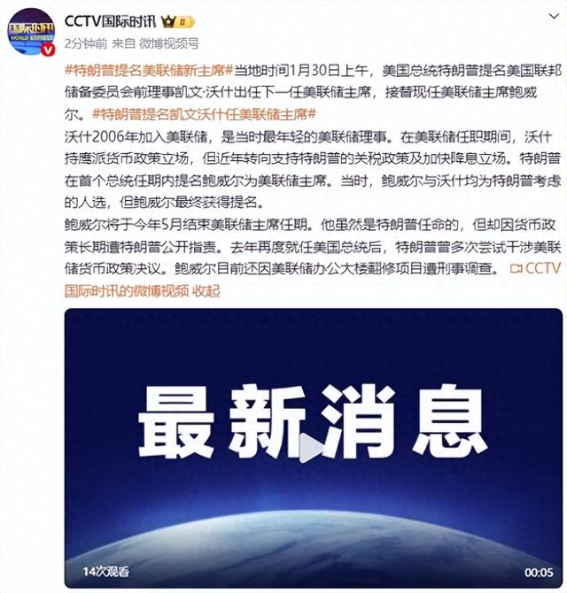当地时间1月30日上午,美国总统特朗普提名美国联邦储备委员会前理事凯文·沃什出任下一任美联储主席,接替现任美联储主席鲍威尔。